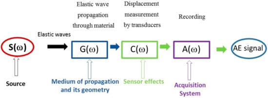 Figure 1 represents the whole AE process. The AE signal is the convolution of the AE source mechanism and the different transfer functions of the propagation medium, of the sample geometry, of the sensor and of the acquisition system. The propagation of acoustic signals is subject to boundary effects; in addition, the propagation of the elastic waves is subject to attenuation that modifies the waves. In fact, besides the type of failures, the AE signals depend on other parameters such as type of sensor, the sample geometry and propagation distance. All these parameters influence the AE signal [15,16,17,18,19,20,21,22]. In AE analysis, it is important to distinguish the effect of the AE source from the influence of the propagation medium and the recording system. The quantitative AE method requires understanding and modelling of all the components in Figure 1. The influence of the propagation medium and its geometry cannot be separated. Nevertheless, the estimation of the transfer function of the sensor and the amplifier can be established with experimental methods. Based on experimental tests, it is not possible to comprehend the impact of the different parameters. Nevertheless, modelling of AE using analytical or numerical methods allows us to go further and establish a quantitative relationship between the AE source and the signal. Various authors have applied analytical or numerical methods to the simulation of AE formation and AE propagation [23,24,25,26,27,28,29,30,31,32,33,34,35,36,37,38]. Following the works of Ono and Ohtsu [28], who proposed a generalized theory of AE by using the integral formulation of elastodynamics, AE sources can be modelled using buried dipoles sources. The AE source was classically modelled as point force couple utilizing a multi-scale approach. In addition, various source-time function are employed which model kinematics. Moreover, signal propagation suffers drastically from boundary reflections, which complicates the identification of the modes. Suzuki et al. [38] extended the analyses to a dissipative medium including a relaxation function. In the case of viscoelastic plates, Giordano et al. [14] developed a model for AE wave propagation and predicted the displacement based on the ray theory. Dietzhausen et al. [23] investigated the dynamic behaviour due to a single fiber break using finite element methods and carried out parametric studies with different laws for the matrix effect (elastic, a non-linear elastic and an elastic-plastic model) and different fiber positions. A dynamic finite element method (DFEM) has been developed for prediction AE waveforms in the far field plates [24,26]. Sause et al. [31] modelled, by a finite element method, AE sources in a composite material for different damage mechanisms, in addition to the signal propagation and the different elements of the acquisition chain. They compared the experimental values of the descriptors with the theoretical values generated by the damage mechanism in order to validate the labelling of the signals. Wilcox et al. [33] have implemented a deterministic modular AE model using analytical formulation for AE sources, finite element methods for the wave propagation and reception by finite sized transducers. For the signal detection, some analytical approaches considered the sensors transfer function explicitly. Some authors [39,40,41,42,43] have proposed a finite element approach to include the piezoelectric sensor in a modelling environment in order to take into account the interface between the sensor and the material.