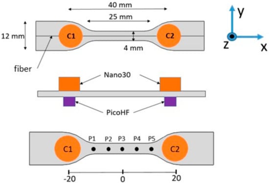 The thickness of the experimental specimens is 2.8 mm or 1.7 mm, respectively. In both cases, the fiber is not positioned in the middle of the sample along the z-axis but rather 0.5 mm from the surface. The position of the fiber is a little asymmetric with respect to the mid-plane of the specimen to excite symmetric and antisymmetric modes. The SFFT is carried out at room temperature and with a deformation rate of 0.5 mm/min ensured by the tensile test machine (type: MTS, capacity 5 kN). The AE monitoring is conducted by means of multiple sensors using a PCI-2 data acquisition system (Mistras Group, Sucy en Brie, France). In order to study the sensors’ effects, tensile tests are conducted with two types of sensors (nano30 and picoHF sensors) placed at the same position on each face of the specimen 40 mm apart (Figure 2). These two sensors show a good sensitivity in the frequency range of 200 to 400 kHz for nano30 sensor and 500-1850 kHz for picoHF sensor (Mistras Group data). Thus, by using both of them for tensile testing it is interesting to investigate, from an experimental point of view, the effect of the sensor on AE descriptors. In all tests, the coupling agent is medium viscosity vacuum grease.