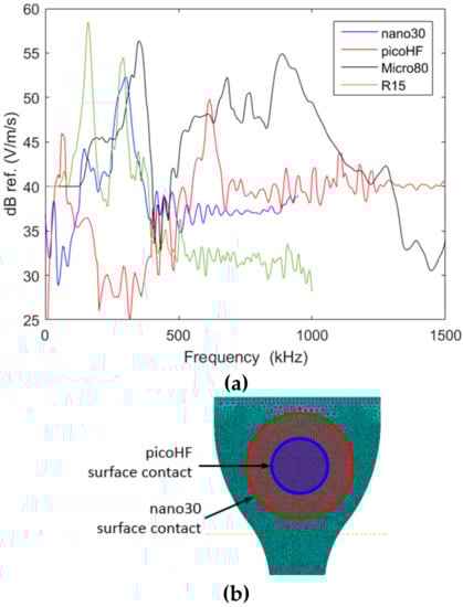 where Vsensor is the velocity calculated with considering sensor, Vsurface (ω) represents the mean of out of plane velocity on the surface and Ssensor (ω) the sensitivity function. In this study, the coupling medium is not taken into account. All numerical velocity signals are filtered with a Butterworth 20 kHz to 1200 kHz band pass filter. As it has been pointed out in literature [39,52,53], the propagation medium used for calibration will not only disturb the signals due to modifications in the waves velocity but will also modify the sensor response due to change in acoustic impedance. In this study, we do not take into account such change of the sensor response. As reported by [42,53,54], the couplings show slight influence of the sensors reception sensitivity, but this is negligible compared to the other contributions. Since no measurements were possible for frequencies below 100 kHz for Micro80 and R15 sensors, we assigned the missing values to the value of the sensitivity obtained for 100 kHz. Similarly, we extended the missing range for nano30 and R15 sensors, above 1 MHz, by the constant value obtained for the calibration at 1 MHz.