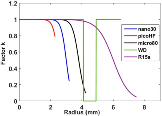 Asensor represents the area of the sensor. The radius for the sensors are equal to Rnano30 = 3.2 mm, RpicoHF = 2.3 mm and RR15 = 7.5 mm. In order to take into account the aperture effect, we introduce the k parameter, which is a real number between 0 and 1. It represents the sensitivity of a point at the distance r from the centre of the sensor surface. Figure 5 represents the evolution of the parameter k. This evolution is deduced from the work of Boulay [42]. The aperture function depends not only on the geometry of the sensor and the spatial evolutions of the sensitivity of sensor surface but also on the frequency. In this study, we do not take into account the effect of the frequency.