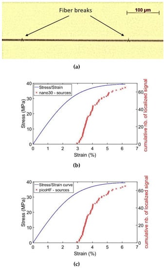 (a) Fiber breaks as observed by optical microscopy. Cumulative localized signal and applied stress versus strain during SFFT detected by (b) nano30 and by (c) picoHF (e = 2.8 mm and z = 0.9 mm, Test 04).