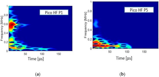 Figure 7 and Figure 8 show the time-frequency maps obtained with Smoothed Pseudo Wigner-Ville Distribution (SPWVD) for signals assigned to fiber breaks for two positions of the source: near the sensor (position P1, at 6 mm from the sensor centre) and far from the sensor position (position P5, at 34 mm from the sensor centre). Figure 7a,b show the dispersion of the wave modes. For the shortest propagation distance, the main energy in the signal is concentrated around 10 μs and in the range of 200–400 kHz. When the propagation distance increases, the lower frequencies tend to arrive later in the signal. We can observe a significant decrease in the frequency content certainly due to the propagation effect. Their signatures vary due to differences in the propagation distance. For the same signals recorded by the picoHF sensors, the SPWVD (Figure 8) reveals a higher frequency content, especially at the P1 position. In this case, the main energy on the signal is concentrated around 10 μs and in the range of 400–700 kHz. At the position P5, the main energy is in the range below 300 kHz. The acoustic signature of the fiber break varies due to the choice of the sensor.