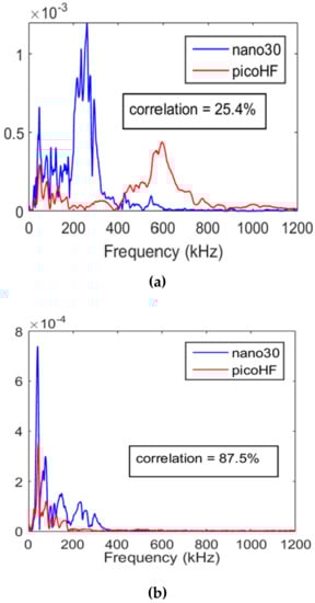 FFT of the experimental signals recorded by the sensor nano30 and picoHF for the same fiber break (a) near the source and (b) far from the source (e = 2.8 mm and z = 0.9 mm).