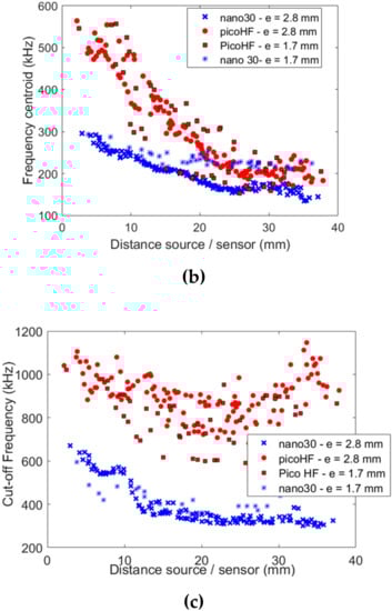 Descriptors of the experimental signals recorded by the nano30 and picoHF sensors for the same test (e = 2.8 mm and z = 0.9 mm or e = 1.7 mm and z = 0.25 mm): (a) Amplitude (b) Frequency centroid and (c) Cut-off frequency.