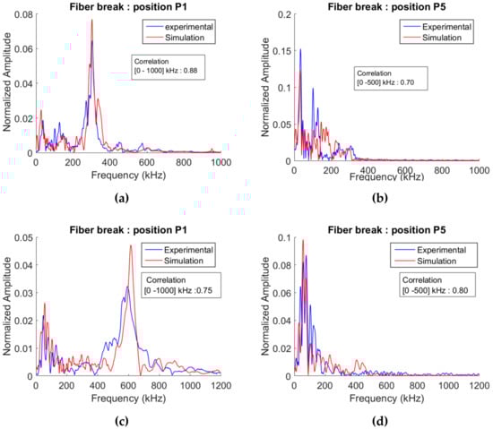 Comparison between the FFT of simulated waveforms and experimental waveforms for two positions P1 and P5 of the fiber break (a,b) nano30 and (c,d) picoHF (e = 2.8 mm and z = 0.9 mm).