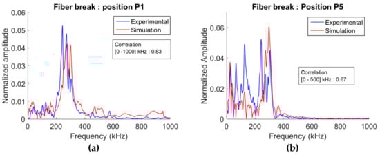 Comparison between the FFT of simulated waveforms and experimental waveforms for two positions denoted P1 (near the source) (a) and P5 (far from the source) (b) for nano30 sensors (e = 1.7 mm and z = 0.35 mm).
