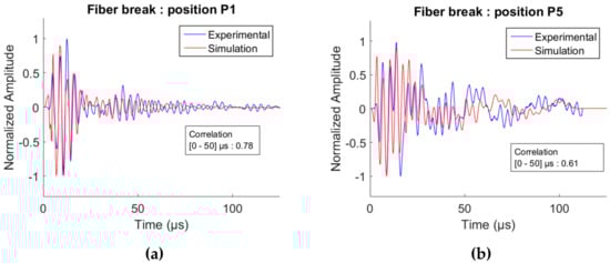 Comparison between the simulated waveforms and experimental waveforms recorded with the nano30 sensors for a fiber break at (a) P1 (near the source) and (b) P5 (far from the source). (e = 1.7 mm and z = 0.35 mm).