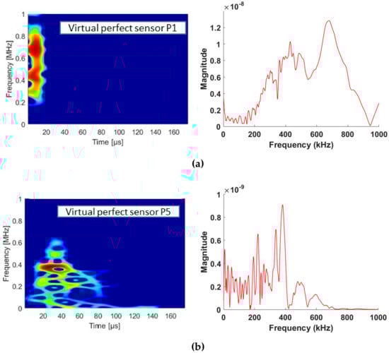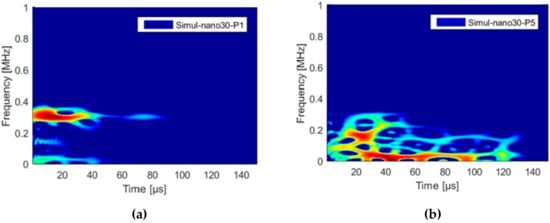 SPWVD of simulated signals recorded by nano30sensors (a) near the source P1 position and (b) far from the source P5 position (e = 2.8 mm and z = 0.9 mm).