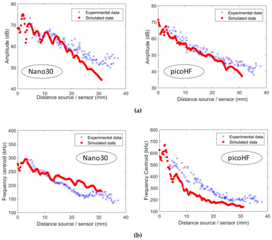 Descriptors vs. source/sensor distance for experimental signals and numerical signals detected by nano30 and PicoHF sensors: (a) amplitude in dB, (b) frequency centroid in kHz, e 2.8 mm and z = 0.9 mm.