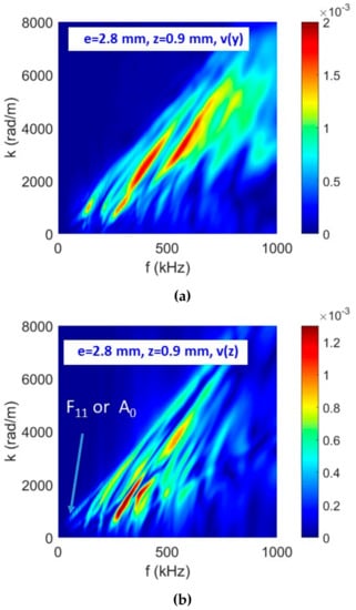 Simulated dispersion curves (wavenumber k versus frequency f) via 2DFFT of signals recorded along a straight line for a fiber break at the position P2 (a) on the lateral side of the specimen v(y) (b) on the top surface v(z) of computational specimen (e = 2.8 mm and z = 0.9 mm).