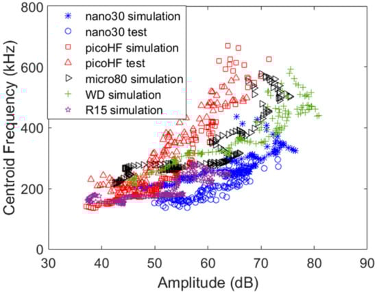 The aperture effect consists of the progressive elimination of higher frequency wavelengths. The frequency response of the AE sensor strongly influences the characteristics of the output signal. This result shows a strong influence of the type of sensor, which controls the frequency content such as frequency centroid or peak frequency (two common features used). In this context, it is difficult to develop generalized pattern recognition methods using the resonant type AE sensors. It is further noted that the R15 sensor is active in a smaller frequency range than that of the WD, hence energy distribution with frequency seems to match with the sensor properties near the source. The peak amplitude is also strongly affected by the sensor. With the numerical approach, it may be possible to enlarge the library with the acoustic signature obtained with different sensors.