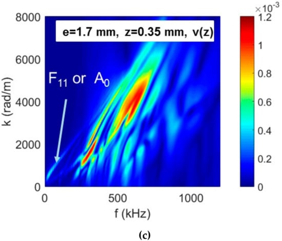 Simulated dispersion curves via 2DFFT of signals v(z) recorded on the top surface for a fiber break located at the position P2, (a) e = 2.8 mm and z = 0 mm, (b) e = 1 mm and z = 0 mm and (c) e = 1.7 mm and z = 0.35 mm.