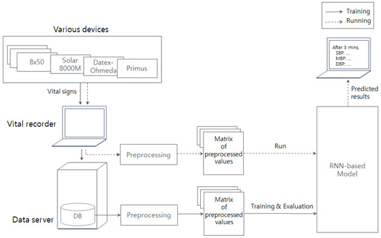 Figure 1. The model is designed to incorporate underlying sequential patterns of the vital signs, and evaluated by averaged absolute errors of 10-fold cross-validation. At the running phase, future blood pressures will be predicted given the vital signs for previous few minutes (e.g., 3 min). As this paper is a feasibility study, it is not ready for deployment; it must be carefully deployed because this is a life and death situation. We will keep collecting more data and improving the model for deployment.