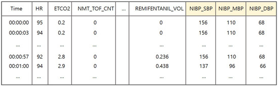 Table 1. Each dimension of the vector has a distinct sampling rate; for example, BIS/SQI and BIS/BIS are collected every second, whereas TV and MV are collected every six seconds. To address this issue, we assume that all dimensions have the common sampling rate (i.e., three seconds). For example, the blood pressure values (e.g., mean blood pressure (MBP), systolic blood pressure (SBP), diastolic blood pressure (DBP)) are obtained every 1∼3 min (mostly every minute), so these values are assumed to be fixed until their new values come in. That is, if the MBP value is sampled every minute, then the MBP values for every 20 timesteps will be the same.