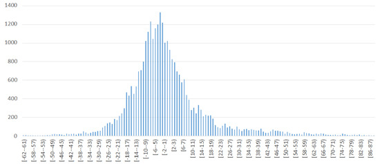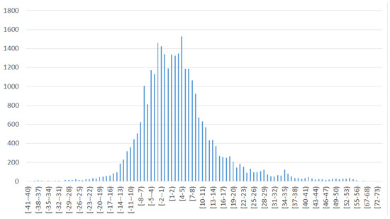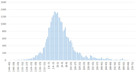 Figure 7 depict histograms of errors, where horizontal axis represents error bins; for example, a bin [1–2) represents the range