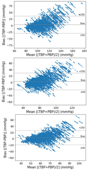 34]. In this regard, as the mean absolute errors of our model for SBP and MBP were 11 mmHg and 9 mmHg, respectively, which does not meet the AAMI standards. However, there is no consensus on the accuracy of clinically acceptable blood pressure because the AAMI standards are for the approving clinical validation of new automated blood pressure devices.