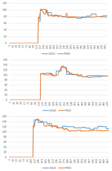 Figure 9 shows three plots of SBP prediction, where the two upper examples are relatively well predicted cases and the bottom example shows a poorly predicted case. Please note that the model gives its first prediction at the 120-th timestep because it sees the sequential data of three minutes (i.e., 60 timesteps) and predicts three minutes later (i.e., 60 timesteps). Because the SBP is sampled every minute, the plot of true SBP looks like stairs. Generally speaking, the three figures in