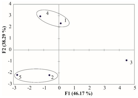 All fresh strawberry samples (observations) in the factor plane were classified by principal component analysis (PCA), based on their chemical compositions (Figure 1). The first two principal components (PC) represented 84.46% of the initial variability of the data (PC1—46.17% and PC2—38.29%). Factor loadings of PC1 and PC2 are listed in Table 2. In brief, PC1 was strongly correlated with potassium, iron, magnesium, manganese and water, unlike PC2 with glucose, fructose, sucrose, carbohydrates and total soluble sugars (factor loadings >0.8). Consequently, PC1 and PC2 can be interpreted as mineral and sugar composition components, respectively. By the means of the chemical analyses, the following clustering pattern was observed: 1st group—the strawberry samples 1 and 4; 2nd group—the strawberry samples 2 and 5; 3rd group—the strawberry sample 3. Indeed, the most promising breed line (sample 3) was totally separated from the rest of the samples examined.