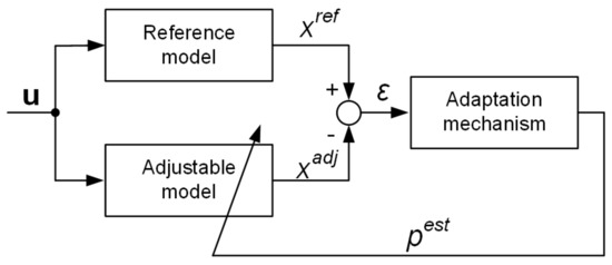 General idea of MRAS type parameter estimator (u—input signals vector, xref—reference value of chosen signal, xadj—adjustable (estimated) value of chosen signal, pest—estimated parameter, ε—error between reference and adjustable model).