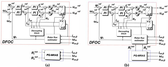 - Active power based (P-MRAS)—proposed in [19] for stator resistance estimation. Similarly to Q-MRAS, it is implemented only in the synchronous reference frame (x-y), which determines a strong reliance on the control structure performance. In [20] a semi-active power estimator is proposed to improve robustness on rotor resistance variation. In [21] it was used for rotor resistance estimation.
