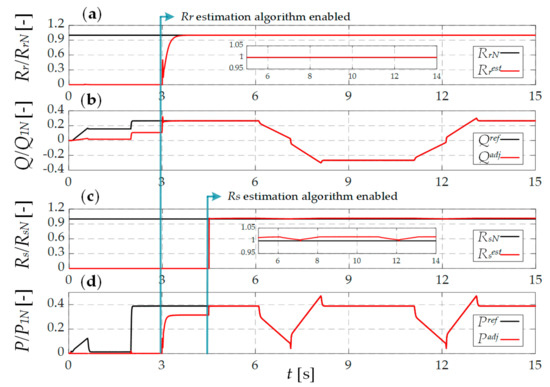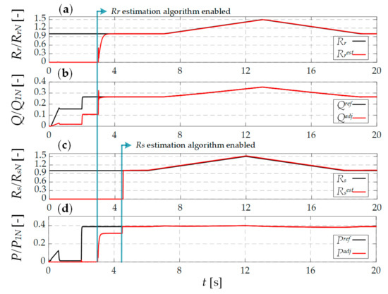 A similar study was performed with a voltage model [1] instead of the current model as the estimator of the rotor flux (18). This estimator directly depends on the stator resistance value (current model depends on rotor resistance). Therefore, it can be used to evaluate P-MRAS operation in the closed-loop mode. The estimated stator resistance was injected into the control system at t = 11 s, which resulted in the improvement of the rotor flux estimation accuracy (Figure 14 and Figure 15).
