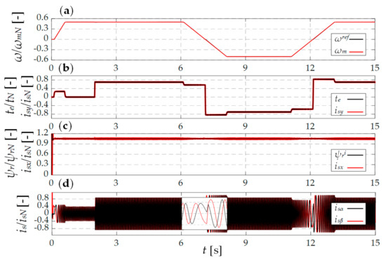 State variables of the drive: (a) reference and simulated rotational speed, (b) electromagnetic torque and stator current component isy, (c) estimated rotor flux vector module and stator current component isx, (d) stator current components isα,β; (simulation results), (ωmref = ±0.5 ωmN, tL = ±0.75 tN, Rr = RrN, Rs = RsN).