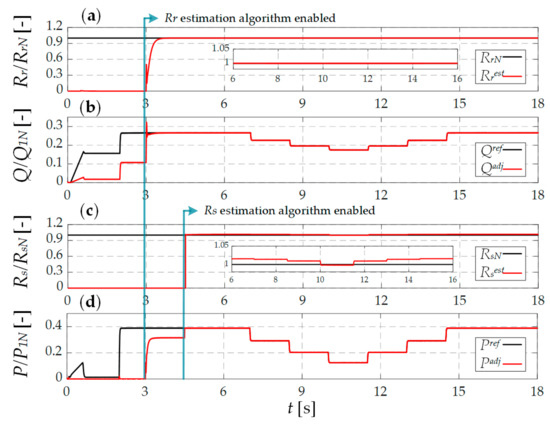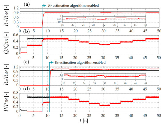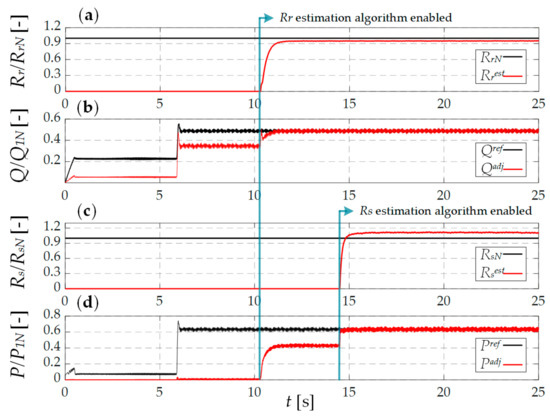 Operation of the PQ-MRAS estimator: (a) estimated rotor resistance, (b) reference and estimated reactive power, (c) estimated stator resistance, (d) reference and estimated active power; (simulation results), (ωmref = 0.5 ωmN, tL = 0.75 tN, Rr = var, Rs = var).