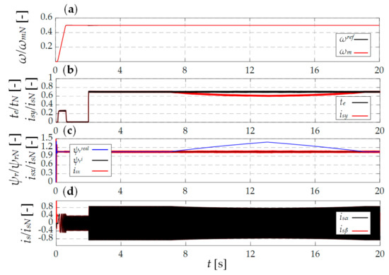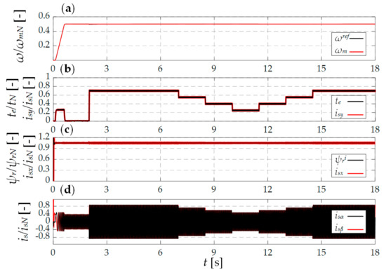 State variables of the drive: (a) reference and simulated rotational speed, (b) electromagnetic torque and stator current component isy, (c) estimated rotor flux vector module and stator current component isx, (d) stator current components isα,β; (simulation results), (ωmref = 0.5 ωmN, tL = var, Rr = RrN, Rs = RsN).