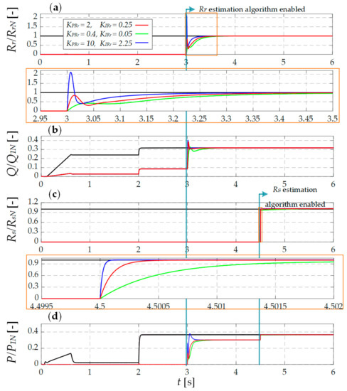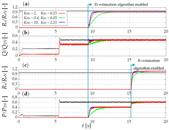 Operation of the PQ-MRAS estimator for different values of parameters in adaptation mechanisms: (a) estimated rotor resistance, (b) reference and estimated reactive power, (c) estimated stator resistance, (d) reference and estimated active power; (simulation results), (ωmref = 0.5 ωmN, tL = 0.75 tN, Rr = RrN, Rs = RsN).