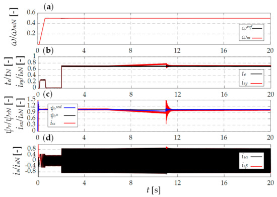 State variables of the drive: (a) reference and measured rotational speed, (b) electromagnetic torque and stator current component isy, (c) estimated rotor flux vector module and stator current component isx, (d) stator current components isα,β; (simulation results), (ωmref = 0.5 ωmN, tL = 0.75 tN, Rr = var, Rs = var).