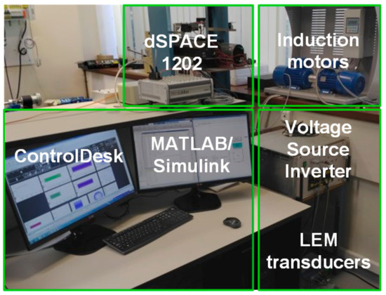 The experimental verification of the PQ-MRAS estimator was carried out on the laboratory setup shown in Figure 16. The setup consisted of two induction motors coupled by a clutch—one motor was controlled by the DFOC algorithm, the other one worked as a load. The control algorithm and PQ-MRAS were implemented in a rapid prototyping unit dSPACE MicroLabBox (dSPACE Inc., Wixom, MI, USA) through the MATLAB/Simulink software (version 2015b, The MathWorks). The drive system was controlled in real-time by an application created in the ControlDesk software (version 5.4, dSPACE Inc., Wixom, MI, USA).