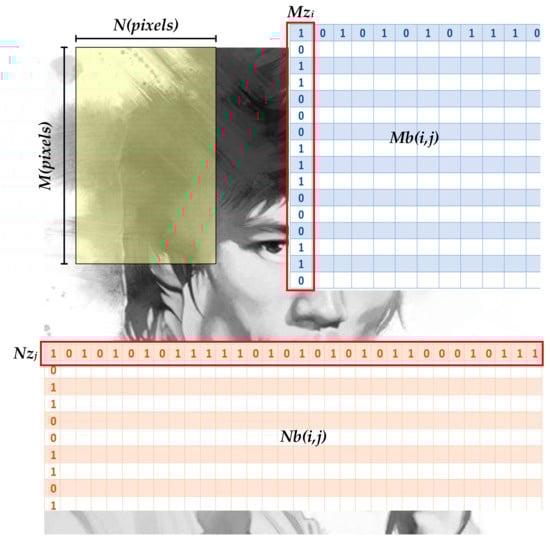 One of the important characteristics of an image is the strong correlation between adjacent pixels. Therefore, the main mission of the confusion stage is to destroy the relationship of adjacent pixels by relocating those pixels (bit-level) in the horizontal and vertical directions. However, this consumes much computing time and many resources if all of the relationships of adjacent pixels in a plain image are to be broken at the same time—a huge matrix of new locations has to be generated. As a result, an appropriate size of window M × N was selected in this article to shuffle each subimage content at the bit level, where new limited locations for each bit number could more effectively be produced. The schematic diagram is shown in Figure 2a,b.
