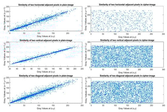 where x and y are gray values of two adjacent pixels in the image. Figure 11 and Figure 12 show the correlation of two adjacent pixels. The high correlation of adjacent pixels from the original image in three different directions can be observed on the left-hand side in Figure 11 and Figure 12; every dot is located linearly along the diagonal, whereas in the cipher image, every point is scattered on the entire plane. Thus, the correlation between adjacent pixels was reduced after applying the encryption process.