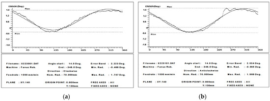 Depending on the 70 mm radius of the circular contouring, an eccentricity of 14.142 mm results in measuring deviation of ±11.56 degrees as shown in Figure 4. Figure 4 shows the angle error due to eccentricity, and the resultant error is seen to be a sine curve.