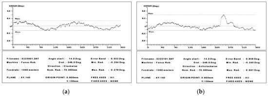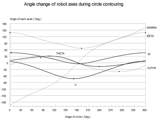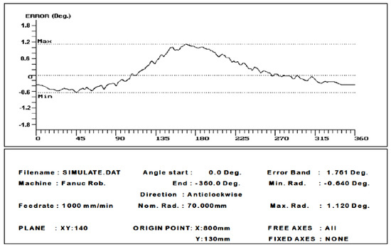 The simulation result of the circle contouring is shown in Figure 8a,b. The simulation procedure is the same as mentioned [24]. The X, Y, and Z positions to make the theoretical circle contouring in the robot working space is calculated and input into the inverse kinematic solution program, and then the corresponding angles of the W and U axes are found i.e., the X, Y, and Z positions in the robot working space correspond to the angles of the W and U axes. The calculated angles and the datum location error of the gamma and beta axes were input in the kinematic solution. The result of this computation gives the X, Y, and Z positions of the robot with the influence of the datum location error of the gamma and beta axes. For comparison with the experimental results the circle radius and error band were evaluated. Figure 8a shows orientation error of yaw motion in the clockwise direction. Figure 8b shows the same in the anticlockwise direction. Comparing Figure 8a,b, the error tendency is slightly different due to the backlash of the robot axes. The sudden change is due to the backlash of the theta axes at 237°. Table 1 is shown the backlash point during circulation.