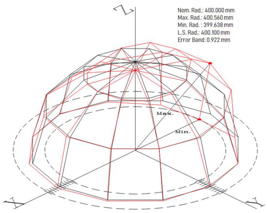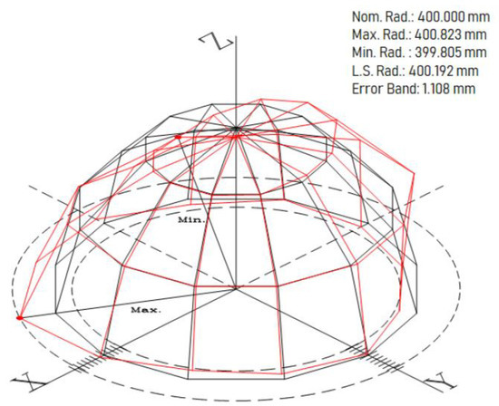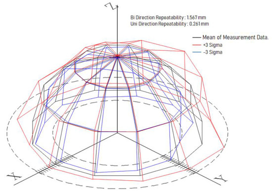 The experimental results are shown in the Figure 13. The experimental result, which is red color in the figure, are the mean value of the three different orientations at the same position of the robot end effector. The least squares sphere, which is black color on the Figure 13, is calculated from the experimental mean value using the least squares approximation method. The nominal radius is 400 mm, but the radius of the least squares sphere is 400.192 mm. The error band is seen to be just greater than 1 mm. The experimental data can also be seen to be distorted to one side when compared with the least squares sphere.