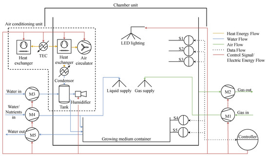 volume with airtight sealable lid was selected. This volume was constrained due to the choice of an off-the-shelf container, which also corresponds to the volume of low- to mid-tier commercial growth chamber. Based on this chosen volume, specification of other modules (e.g., heater, cooler, and pumps) were derived. Modifications to the chamber to obtain desired functionalities are explained in the following sections.