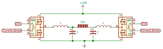 23]. This combination enables the change of current flow direction through the TEC, thus changing its operation mode. Using PWM signals to operate the driver in ON–OFF mode enables the control of current flowing through the device. However, the power loss in TEC module in such a configuration is higher than in the DC mode. To compensate this power loss, a low-pass L-C filter circuit with a cut-off frequency