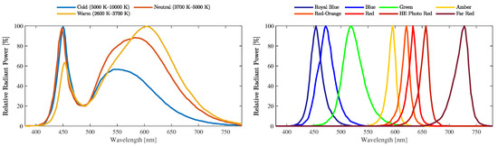 28]. This, therefore, requires light source with adjustable spectral composition and power. Narrow-band LEDs covering a wide range of wavelengths and wide-band white LEDs, as shown in