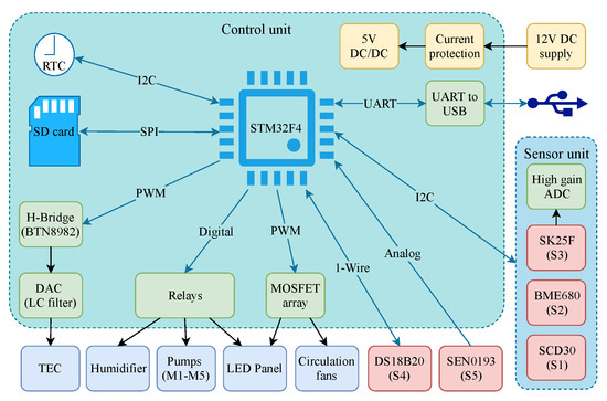 . It is connected to a SD card for local data logging and storing configurations and calibration data. A real-time clock (RTC) is used for time keeping and timestamps for logged data. Communication to external system is realized using UART to USB interface. The PWM peripheral pins drives the LED lighting system, TEC heating-cooling system, internal circulation fans, and external heat exchanger fan. General purpose input–output drives the electromechanical relays of the LED group switch and Pumps M1–M5. The entire system is designed to be operated using a single 12