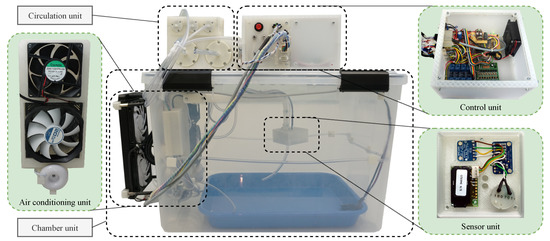 , respectively, was selected for highest performance. The side of the TEC module facing the inner side of the chamber is interfaced with an aluminium passive heat exchanger while the opposite side with an active water cooled heat exchanger. A combination of two PC-cooling fans are used in push–pull arrangement to actively cool the otherwise passive heat exchanger and also to introduce air circulation inside the chamber unit. This design choice of non-similar heat exchanger is made to improve the cooling/heating performance while maximizing the inner volume of the chamber unit. In cooling mode of operation, the inner heat exchanger condenses water, which is accumulated in a reservoir. An ultrasonic atomizer is integrated into the reservoir using the water stored in it for humidification. The enclosure is a custom designed 3D printed part with an integrated reservoir and encapsulates the passive heat exchanger, air circulation fans, and humidifier. These parts, as depicted within dashed box in