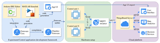 Figure 7, with a three part solution: (1) open-source firmware core for control unit with necessary drivers, middleware and application interface for reliable operation of the chamber; (2) cloud platform with data, protocol and web sever for data aggregation. data visualization. and interaction with chambers for process control; and (3) code generation framework for control application or experiment regime development. This architecture facilitates the use of the controlled environment for different subjects and executing different experiments. The following sections explain the software design of the IoT Framework and device firmware in detail.