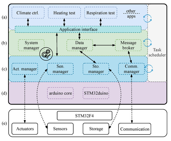 Figure 8. The hardware abstraction layer is dependent on the microcontroller and is based on the Arduino libraries (arduino core) ported for STM-32 microcontrollers (STM32duino). The device manager layer contains managers, implemented as state machines, specific to each electronic component connected (e.g., sensors and actuators). These managers are responsible for: data access from sensors, driving the actuators, monitoring for faults, scheduling the measurements at specified intervals, intercepting external communication, and logging data. The middleware layer contains managers, which serve as brokers that direct the flow of data between the modules of different layers. Data from the sensors are accessed by the modules of different layers using a data structure managed by data manager. The message broker directs the function calls and data between the external system (e.g., decision support system or user) and the corresponding manager modules. The system manager checks if all other managers are running, periodically servicing the watchdog timer, and re-initializing their state machines in the case of error. The task scheduler implemented is preemptive priority based, with highest priority assigned to the components of device manager layer and lower priority to the layers above it. The application interface translates control decisions made by the application layer into suitable actuator commands, thus abstracting the application logic from the hardware. The application layer contains the experiment regimes or apps (e.g., climate control, respiration test, etc.) that are custom developed. This abstraction provides the system its programmability aspect that enables users to develop these regimes and execute them without having to deal with the underlying hardware and firmware.