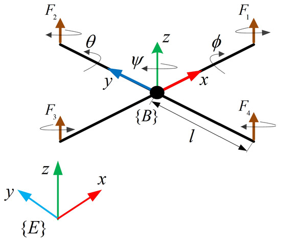 In this section, we briefly present the quadrotor dynamics model, as it was clearly introduced and verified in many previous studies [34,43,50,51].