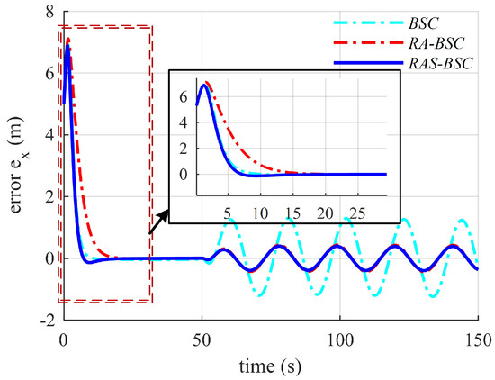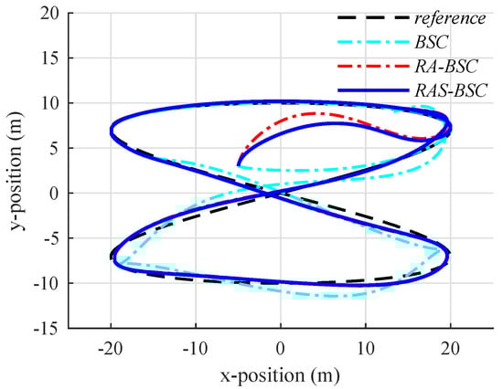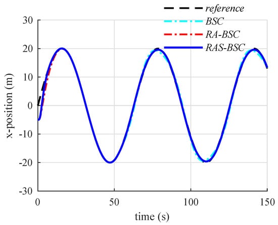 Comparison of x-position tracking error performance between our new controller (RAS-BSC) and existing controllers.