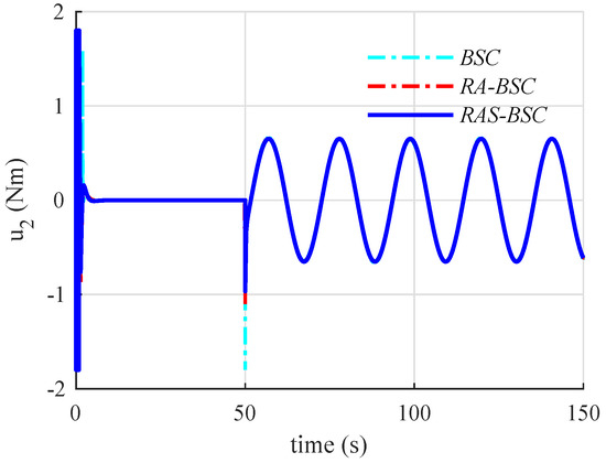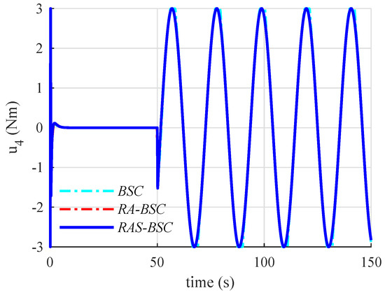 During the second stage (from s to s), the lumped disturbances are applied to the simulation. As a result, and despite having shown a faster initial response (in the first flight stage) than both RA-BSC and RAS-BSC, the BSC tracking performance deteriorates dramatically once the disturbances influence the system (Figure 2, Figure 3, Figure 4, Figure 5, Figure 6, Figure 7, Figure 8, Figure 9, Figure 10, Figure 11 and Figure 12) and the position tracking error performance exhibits large peak-to-peak amplitudes of oscillation (Table 4). Furthermore, the BSC altitude oscillation remains at a high frequency and never converges to zero (Figure 9). During this stage, the control signals , , and are not saturated (Figure 13, Figure 14 and Figure 15), and, as expected, the position tracking error performance is nearly identical for the RA-BSC and our RAS-BSC. For the RA-BSC, it is, respectively, 0.6 m, 0.7 m, and 0.05 m for the x-, y-, and z-position. Meanwhile, for our new controller, it is 0.6 m, 0.55 m, and 0.05 m for the x-, y-, and z-position, respectively. Furthermore, during this second stage, the control signal becomes saturated (Figure 16), resulting in a considerable degradation of the RA-BSC heading angle tracking performance (Figure 12 and Table 4) with a peak-to-peak oscillation amplitude of 2.4, whereas it is only 0.8 for our controller. The numerical simulation results also show that the saturation amounts corresponding to the virtual control signals and are all bounded (Figure 17), verifying the reasonability of the saturation assumptions made in Section 4, i.e., and .