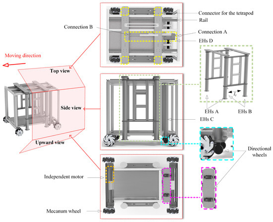 - The hexapod structure is divided into three parts: a tetrapod with electromotive handspikes (EHs), which is used to drive the robot vertically, as well as a chassis frame with a pair of auxiliary wheel-legs and Mecanum wheels, which is used to drive the robot itself horizontally, and the slide-and-rail mechanism, which is used to connect the former two parts;
