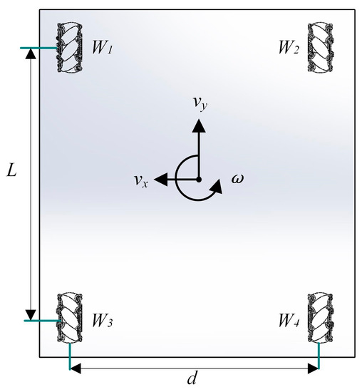where L is the wheelbase, d is the track, and vωn (n = 1, 2, 3, 4) is the rotation velocity of the corresponding wheel Wn.