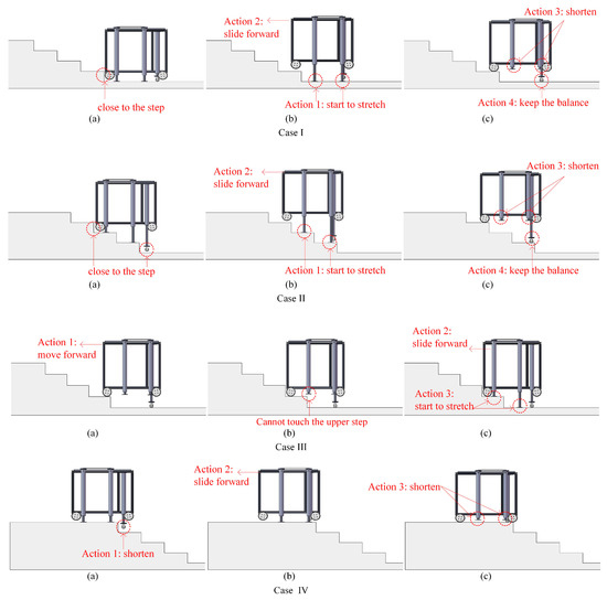 The process of moving downstairs is basically the inverse process of moving upstairs. In other words, the execution sequence of each case above starts from (c) and ends with (a), and the movement direction is also inversed. However, to avoid the risk of falling down, the detection of being “close to the step” when going upstairs is changed to the detection of being “close to the edge of the step”. Every time the robot’s front and rear ends are close to the edge of the step, the robot must stop moving using the wheels immediately. Then, the tetrapod helps the chassis frame to land on the lower step safely. In a similar manner, the basic actions of moving downstairs can also be established, which can be denoted as Case I’, Case II’, Case III’, and Case IV’.