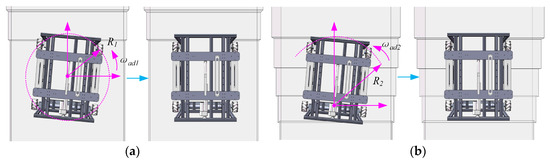 Case 1: As shown in Figure 5a, before the robot starts to climb, the robot’s four Mecanum wheels are on the ground; thus, the control model is no different from the model in Section 3.1. In other words, the rotating velocity of each wheel vωn can be obtained by substituting vx = vy = 0 and ω = ωad1 into Equation (1), where ωad1 is the rotation velocity of the robot when adjusting pose. Then, the robot rotates around the center of the robot’s chassis with a radius of R1 until it is perpendicular to the stairs.